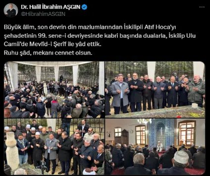 “Büyük âlim, son devrin din mazlumlarından İskilipli Atıf Hoca’yı şehadetinin 99. sene-i devriyesinde kabri başında dualarla, İskilip Ulu Camii’de Mevlîd-i Şerîf ile yâd ettik. Ruhu şâd, mekanı cennet olsun.” ifadelerini kullanmıştı.