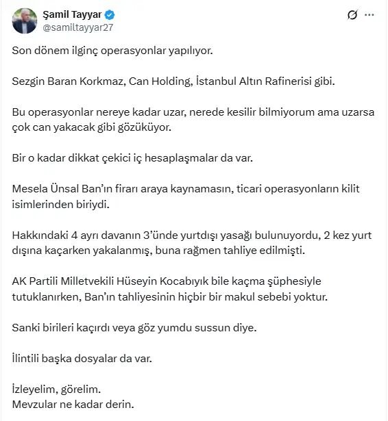 Tayyar, Sezgin Baran Korkmaz’a, Can Holding’e ve İstanbul Altın Rafinerisi’ne yapılan operasyonlara dikkat çekti ve ‘Ünsal Ban’a işaret etti.