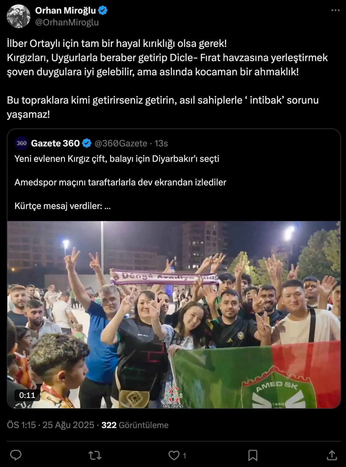 “İlber Ortaylı için tam bir hayal kırıklığı olsa gerek! Kırgızları, Uygurlarla beraber getirip Dicle- Fırat havzasına yerleştirmek şoven duygulara iyi gelebilir ama aslında kocaman bir ahmaklık! Bu topraklara kimi getirirseniz getirin, asıl sahiplerle ‘intibak’ sorunu yaşamaz!”
