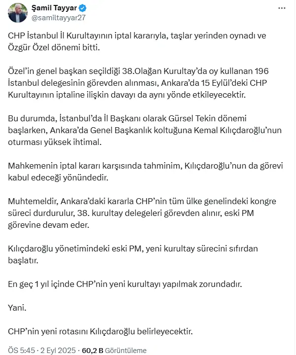 “CHP İstanbul İl Kurultayının iptal kararıyla, taşlar yerinden oynadı ve Özgür Özel dönemi bitti.