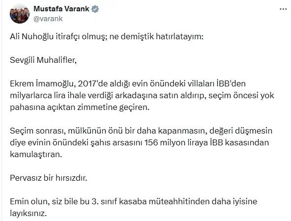 Kararın ardından sosyal medyadan bir paylaşımda bulunan AKP’li Mustafa Varank , henüz iddianamesi hazırlanmayan İBB’ye yönelik soruşturma nedeniyle tutuklu bulunan İBB Başkanı Ekrem İmamoğlu’na ‘pervasız hırsız’ dediği sözleri yeniden paylaştı.