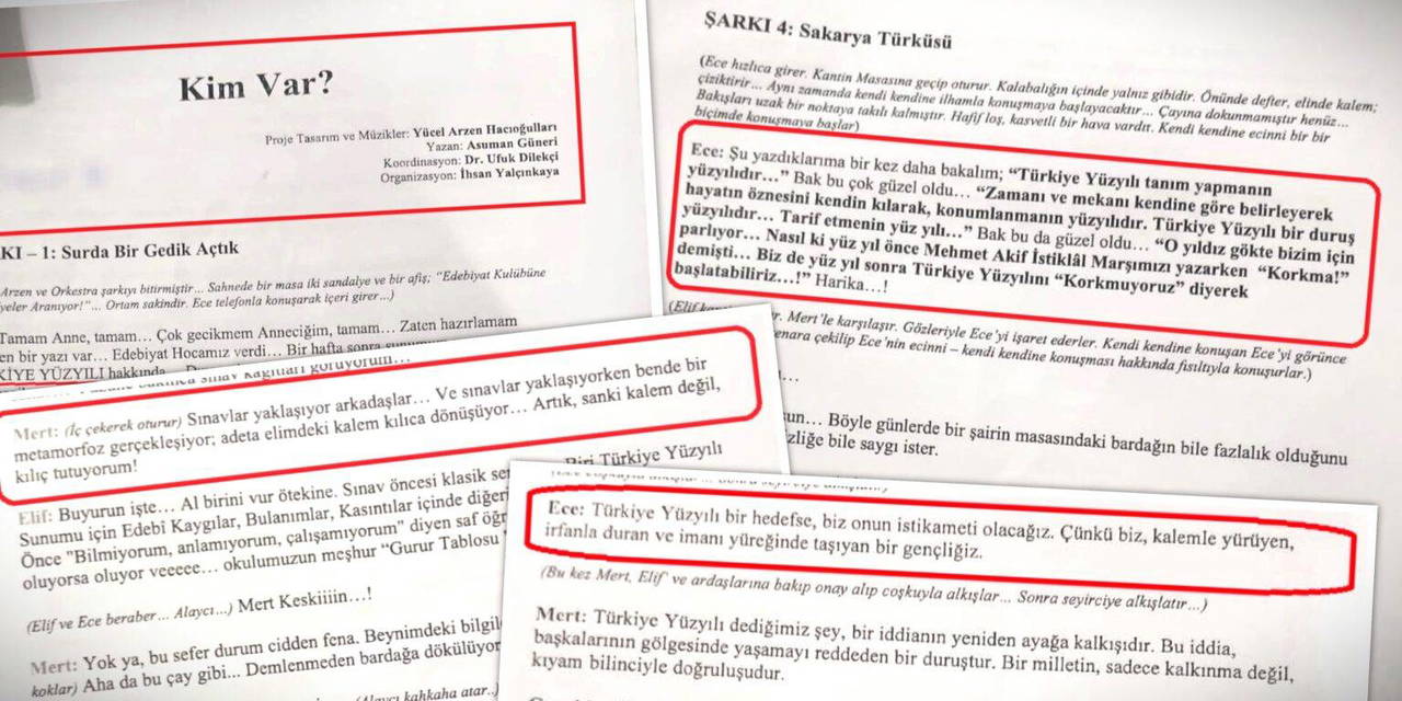 Yine oyunda AKP’nin seçim sloganı olarak kullandığı “Türkiye Yüzyılı” sloganının birçok kez geçtiği, öğrenciler için “Türkiye Yüzyılı bir hedefse, biz onun istikameti olacağız. Türkiye Yüzyılı dediğimiz şey, bir iddianın yeniden ayağa kalkışıdır. Bu iddia, başkalarının gölgesinde yaşamayı reddeden bir duruştur. Bir milletin, sadece kalkınma değil, kıyam bilinciyle doğruluşudur” gibi replikler yazıldığı görülüyor.