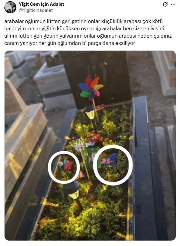 “Oğlumu cinayetten dolayı kaybettim ve mezarındaki eşyaları iki kere çaldılar. Bugün de oyuncaklarını çalmışlar. Lütfen gereğini yapın! Mezar hırsızları var!”