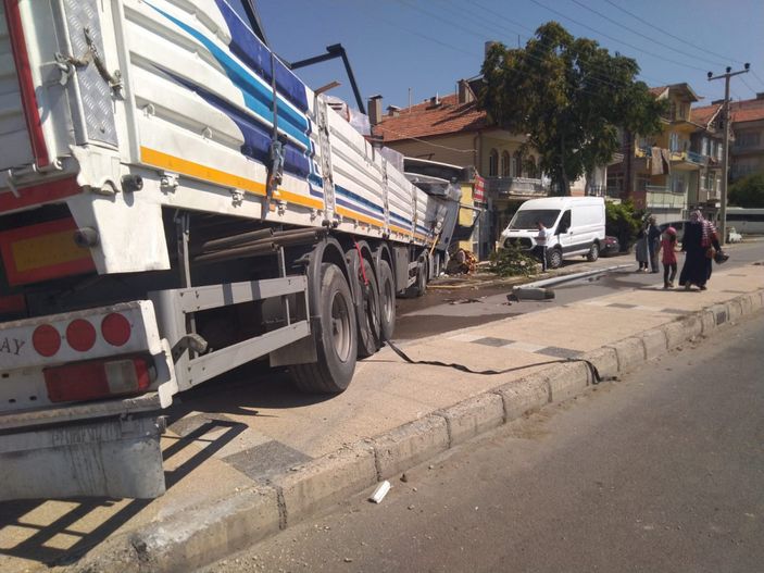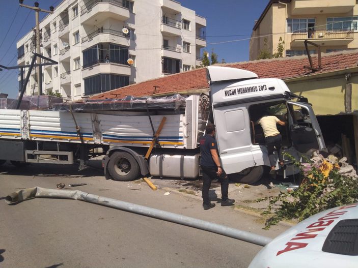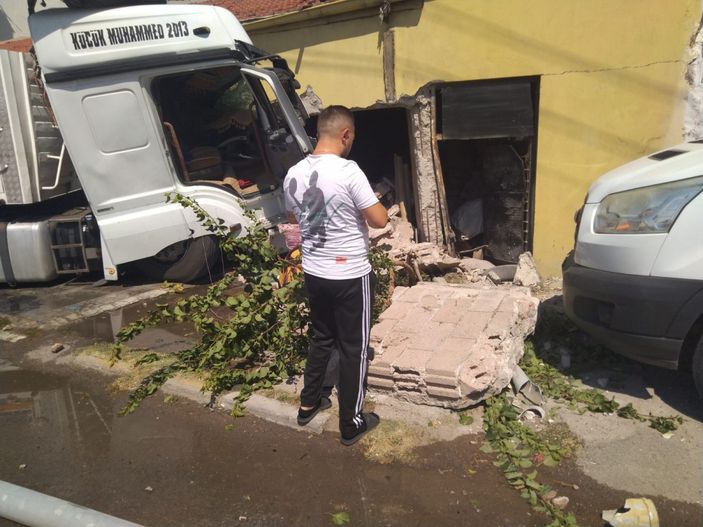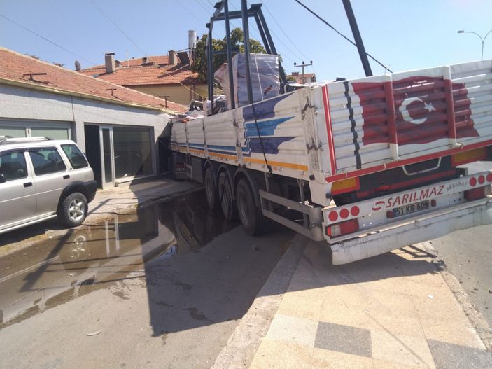 Aksaray’da Yeni Sanayi Mahallesi’nde Durmuş Ergin’in kontrolünü yitirdiği 51 KG 608 plakalı tır, refüjü aşıp karşı şeride geçerek yol kenarındaki boş dükkana çarptı.