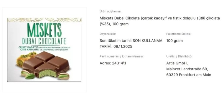 Almanya’nın ‘Gıda Uyarı’ sitesinde de yayınlanan karar, Miskets marka 100 gramlık Dubai çikolatası için alınırken, karara gerekçe olarak da üründe etikette bildirilmemesine rağman susam bulunması gösterildi.