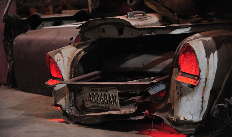 Araç mezarlığında; 2 araç ile bir otomobilin ön, 1 otomobilin arka bölümünün yanı sıra çeşitli araçlara ait koltuk, direksiyon ve yedek parçaları bulunuyor. Görenlerin dikkatini çeken bölümün girişindeki tahta kapıdaysa çok sayı araç farı ve stopu yer alıyor.