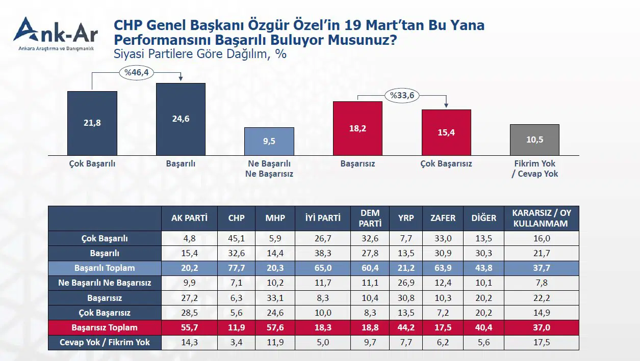 Ankara Araştırma ve Danışmanlık’ın Haziran ayında yaptığı araştırmada Özel’in 19 Mart sonrası liderlik performansı ölçüldü.