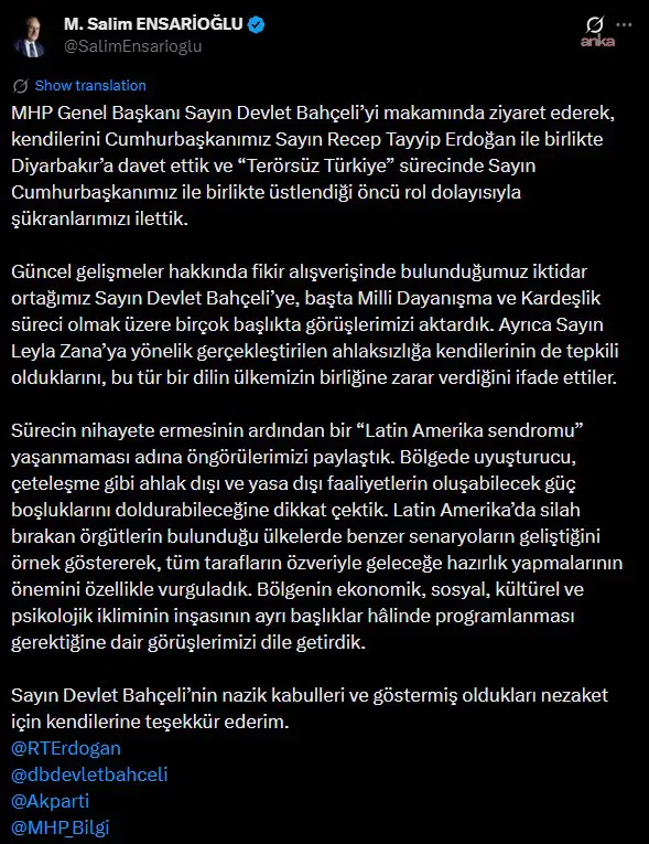 Ensarioğlu, “MHP Genel Başkanı Sayın Devlet Bahçeli’yi makamında ziyaret ederek, kendilerini Cumhurbaşkanımız Sayın Recep Tayyip Erdoğan ile birlikte Diyarbakır’a davet ettik ve ‘Terörsüz Türkiye’ sürecinde Sayın Cumhurbaşkanımız ile birlikte üstlendiği öncü rol dolayısıyla şükranlarımızı ilettik. Güncel gelişmeler hakkında fikir alışverişinde bulunduğumuz iktidar ortağımız Sayın Devlet Bahçeli’ye, başta Milli Dayanışma ve Kardeşlik süreci olmak üzere birçok başlıkta görüşlerimizi aktardık” dedi.