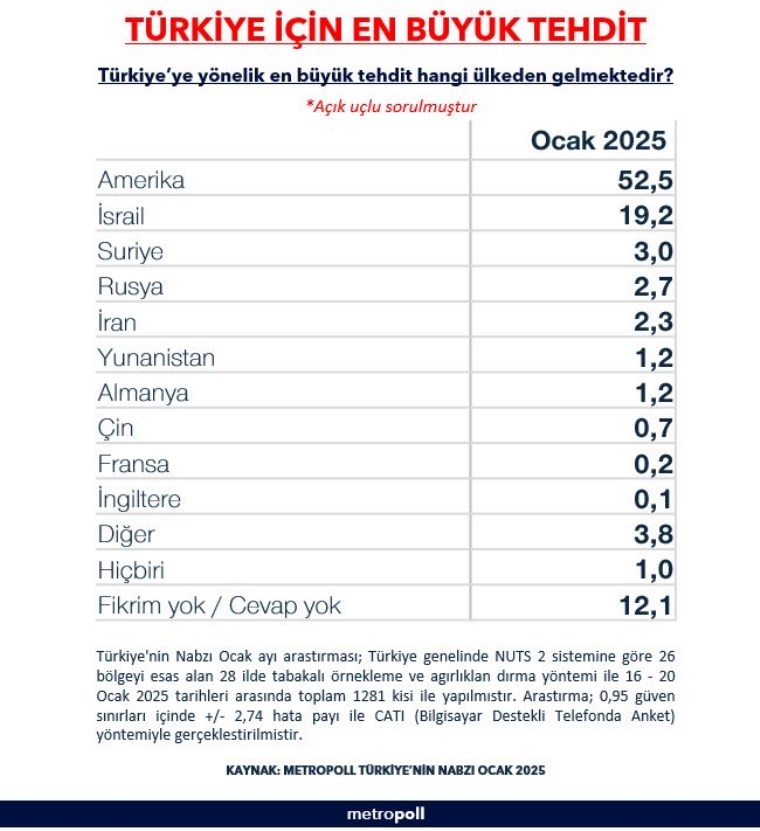 “Türkiye için en büyük tehdit” başlıklı ankette katılımcılara, “Türkiye’ye yönelik en büyük tehdit hangi ülkeden gelmektedir?” sorusu soruldu.