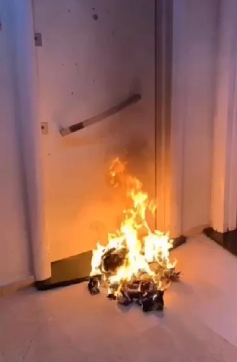 İHA’nın aktarımına göre; kapılara çöpler atıp yazılar yazan kadının, ateş yakarak güvenlik kameralarına zarar verdiği görülüyor.