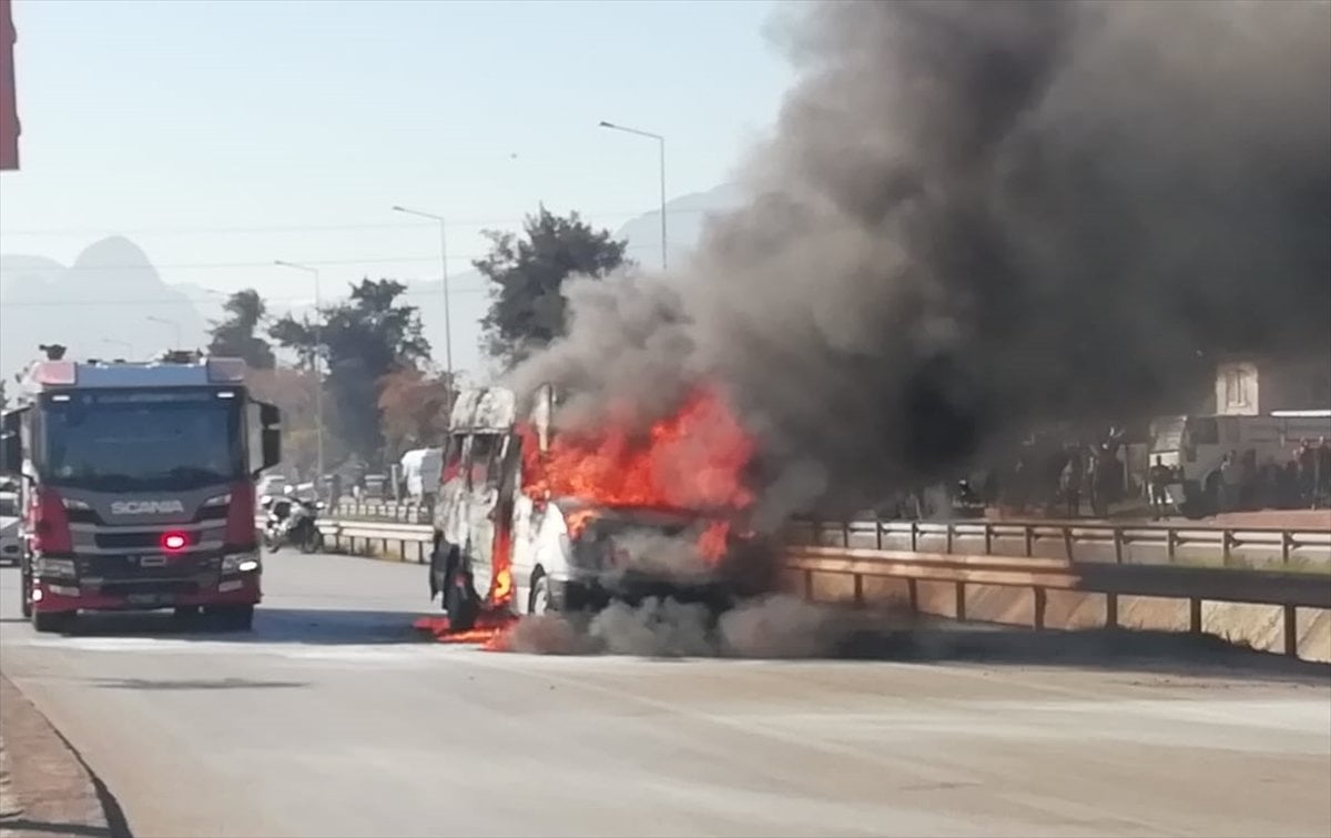 Antalya’nın Kepez ilçesine bağlı Şafak Mahallesi 75. Yıl Caddesi’nde seyir halinde olan bir minibüs, bilinmeyen bir sebeple aniden alev aldı.