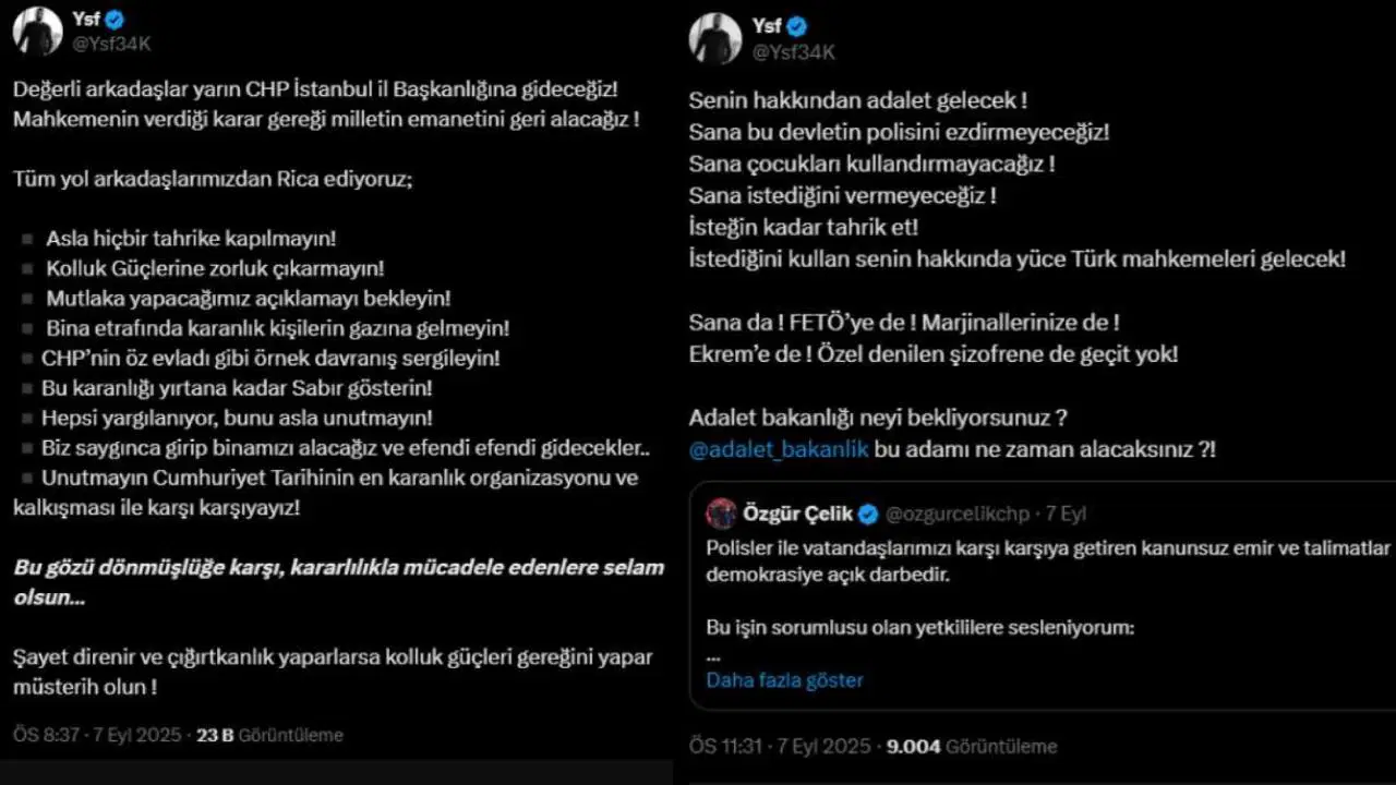 “Değerli arkadaşlar yarın CHP İstanbul il Başkanlığına gideceğiz! Mahkemenin verdiği karar gereği milletin emanetini geri alacağız! Bu gözü dönmüşlüğe karşı, kararlılıkla mücadele edenlere selam olsun… Şayet direnir ve çığırtkanlık yaparlarsa kolluk güçleri gereğini yapar müsterih olun!”