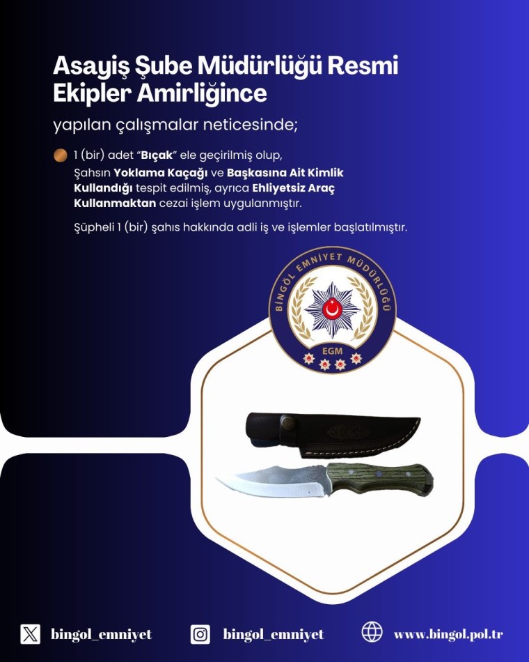Uygulamada yapılan aramalarda, yakalama kaçağı olarak aranan şahıs, üzerinde bıçakla, başkasına ait kimlikle, ehliyetsiz araç kullanırken yakalandı.