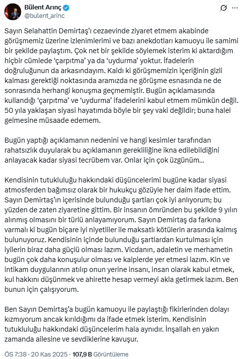 Arınç ise Demirtaş’ın açıklamalarının ardından sosyal medya hesabından bir paylaşım yaparak açıklama yayımladı.
