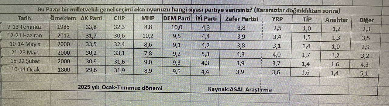 Asal Araştırma, 2025 yılı Ocak-Temmuz döneminde 1985 kişiyle yaptığı seçim anketini paylaştı. 2025’in ilk 7 ayında yapılan bütün seçim anketlerini karşılaştıran tabloda dikkat çeken değişimler görüldü.
