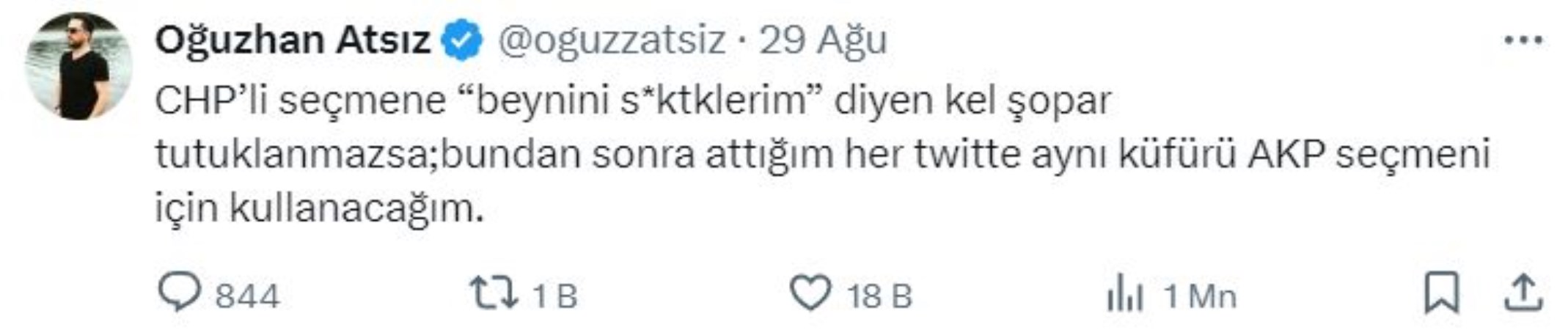 Öte yandan şahsın Atatürk’e ve CHP seçmenine küfür eden Burak Keleş için de X hesabından çağrı yaptığı biliniyor: