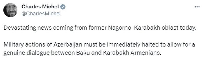 Birliği (AB) Konseyi Başkanı Charles Michel, “Dağlık Karabağ bölgesinden bugün kahredici haberler geliyor.” ifadesini kullandı.