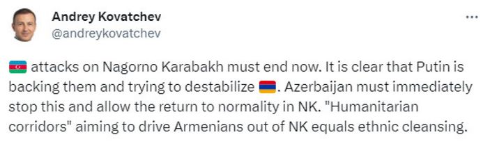 Avrupa Parlamentosu (AP) üyesi Andrey Kovatçev, Azerbaycan’ın Dağlık Karabağ’a yönelik “saldırılarının” artık sona ermesi gerektiğini söyledi.