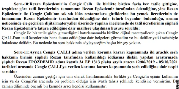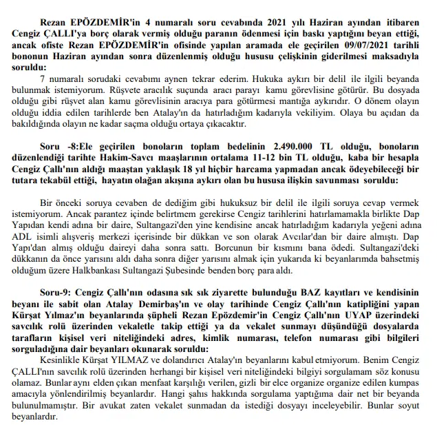 Ayrıca Çallı’nın 2020 yılından itibaren vekaletinin kendisinde olduğunu ifade eden Epözdemir, “Çallı ile tatile ya da mesai dışında yemeğe gittiğimi hatırlamıyorum. Cengiz Çallı’’nın soruşturmasını yürüttüğü hiçbir dosyaya vekalet sunmadım. 2021 yılı Nisan ayı sonrasında işlerimin çok yoğunlaşması sebebiyle Çallı’yı makamında ziyaret etmedim. Ancak bu tarihin öncesinde adliyeye gittiğimde uzun süredir olan tanışıklığımız sebebiyle kendisini ziyaret ederdim” dedi.