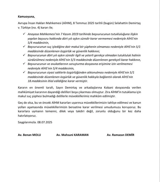 Avukatların yaptığı ortak açıklamada, “Bu ve önceki AİHM kararları uyarınca müvekkillerimizin tahliye edilmesi ve kanun yolları aşamasında müvekkillerimizin beraatine karar verilmesi umudumuzu koruyoruz. Bu kararlara uymanın temenni, dilek veya takdiri değil, zorunlu olduğunu bir kez daha hatırlatıyoruz” denildi.