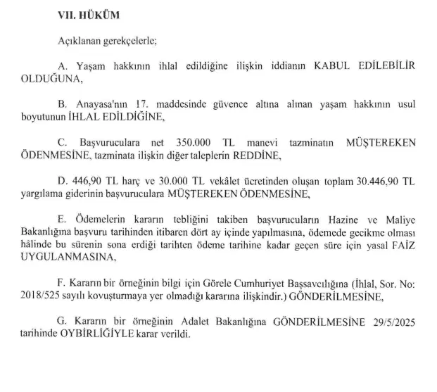 Yüksek Mahkeme, Vatan’ın anne ve babasına 350 bin lira manevi tazminat ödenmesine karar verdi.