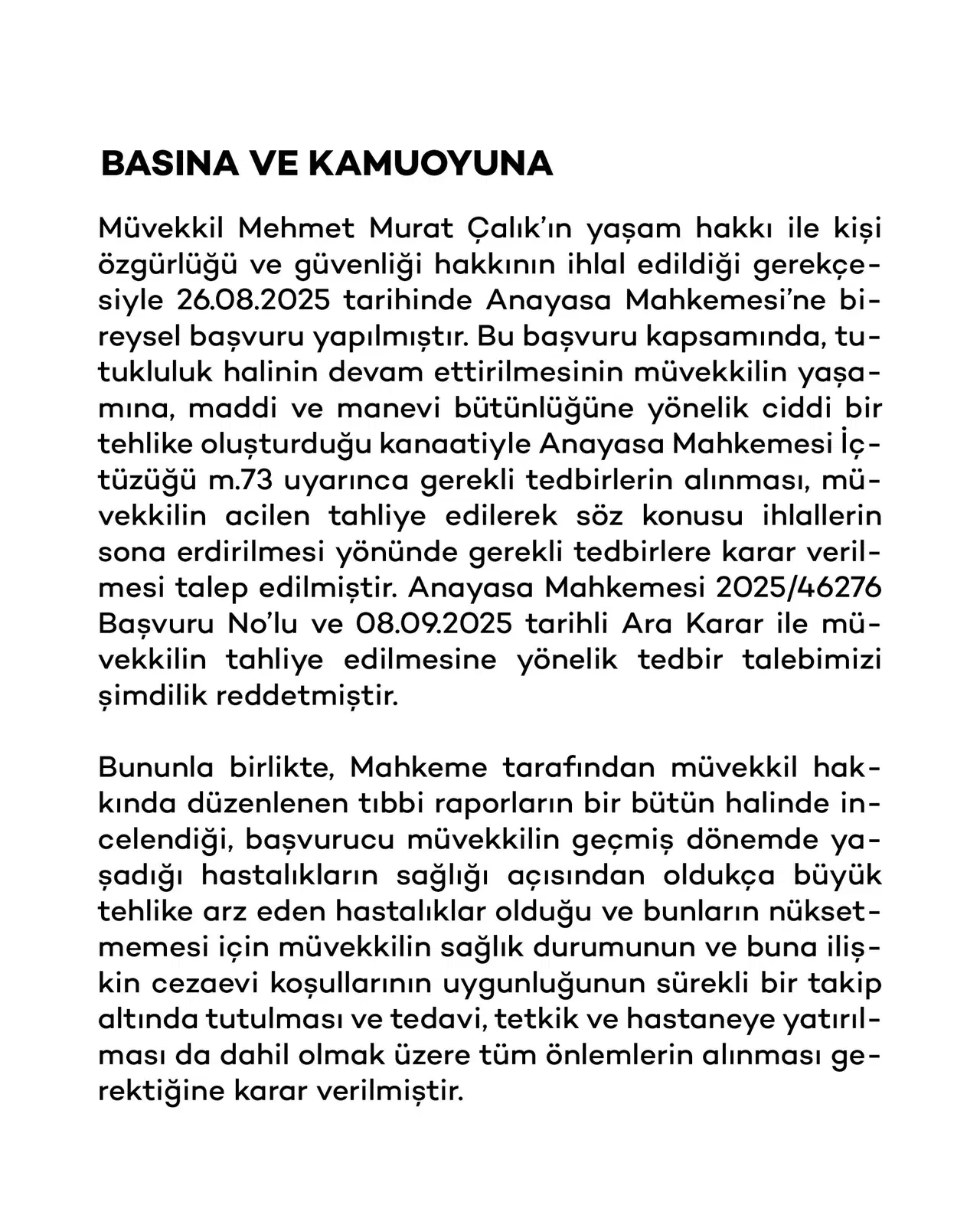 Çalık’ın avukatlarından konuya ilişkin açıklama geldi. Avukatların yaptığı açıklamada, “Cezaevi koşullarında müvekkilin sağlık sorunları devam etmektedir. Hakkında henüz iddianame bile düzenlenmemiş olan müvekkile yönelik geçici nitelikteki ölçüsüz tutuklama tedbirine karşı Anayasa Mahkemesi’nde ve diğer yargı mercilerindeki hak arayışımız devam edecektir” ifadelerine yer verildi.