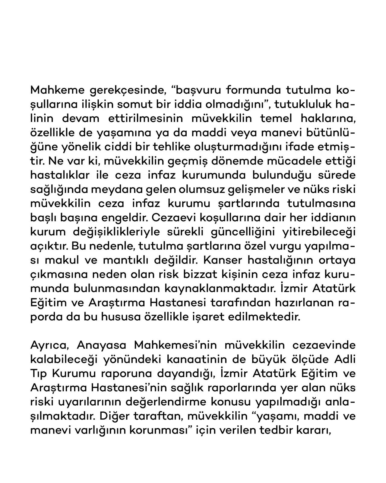 “Başvuru dosyasındaki bilgi ve belgelere göre başvurucunun tutukluluk hâlinin devam edilmesinin tedbir kararı verilmesini gerektirecek nitelikte bir durum olarak başvurucunun temel haklarına, özellikle de yaşamına ya da maddi veya manevi bütünlüğüne yönelik ciddi bir tehlike oluşturduğu söylenemez. Bu noktada Anayasa’nın tutuklu bir kimsenin sağlık gerekçesiyle serbest bırakılması için genel bir zorunluluk getirmediği hususu da tekrar edilmelidir. Açıklanan gerekçelerle, başvurucunun tahliyesinin sağlanmasına yönelik Anayasa’nın 19. maddesi kapsamındaki tedbir talebinin bu aşamada reddine karar vermek gerekmiştir.