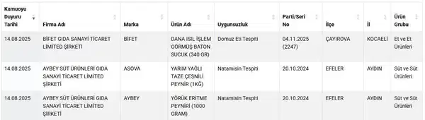 Bifet markalı sucukta ikinci kez domuz eti, Asova ve Aybey markalı peynirlerde ise natamisin tespit edildi.