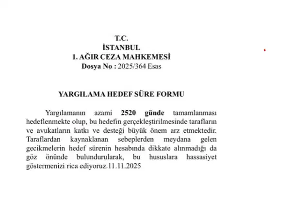 Öte yandan, davanın ek klasörlerine yansıyan bilgilere göre, yargılamanın azami 2520 günde tamamlanması hedefleniyor. Paylaşılan bilgilerde, ‘taraflardan kaynaklanan sebeplerden meydana gelen gecikmeler’in hedef sürenin hesabında dikkate alınmaması gerektiği de belirtiliyor.