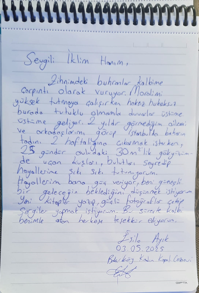 Zihnimdeki buhranlar, kalbime çarpıntı olarak vuruyor. Moralimi yüksek tutmaya çalışırken haksız hukuksuz burada tutuklu olmamla duvarlar üstüme üstüme geliyor. 2 yıldır görmediğim ailemi ve arkadaşlarımı görüp İstanbul’da baharın tadını 2 haftalığına çıkarmak isterken, 25 gündür avludaki 30 metrekarelik gökyüzümde uçan kuşları, bulutları seyredip hayallerime sıkı sıkı tutunuyorum. Hayallerim bana güç veriyor, beni güneşli bir geleceğin beklediğini düşünmek istiyorum. Yeni kitaplar yazıp, güçlü fotoğraflar çekip sergiler yapmak istiyorum. Bu süreçte kalbi benimle atan herkese teşekkür ediyorum.