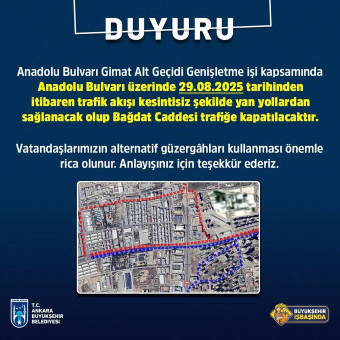 ”Anadolu Bulvarı Gimat Alt Geçidi Genişletme işi kapsamında Anadolu Bulvarı üzerinde 29.08.2025 tarihinden itibaren trafik akışı kesintisiz şekilde yan yollardan sağlanacak olup Bağdat Caddesi trafiğe kapatılacaktır. Vatandaşlarımızın alternatif güzergahları kullanması önemle rica olunur. Anlayışınız için teşekkür ederiz.”