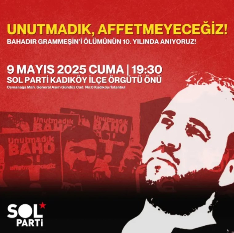 Bahadır Grammeşin’i ölümünün 10. yılında anmak üzere 9 Mayıs Cuma günü saat 19.30’da Sol Parti Kadıköy İlçe Örgütü önünde buluşuyoruz.”