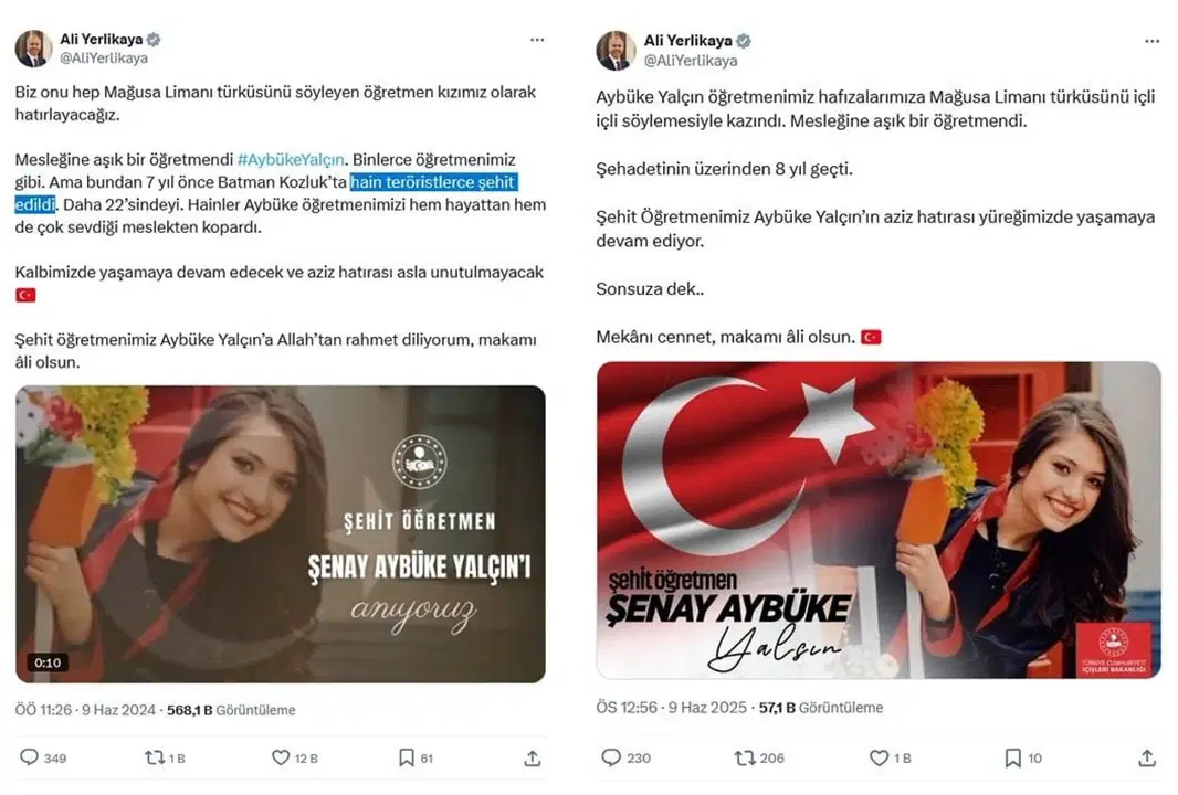 Geçtiğimiz yılki anma mesajında “hain teröristlerce şehit edilen” ifadesini kullanan Bakan Yerlikaya’nın, bu yıl teröre atıf yapmaması dikkat çekti.
