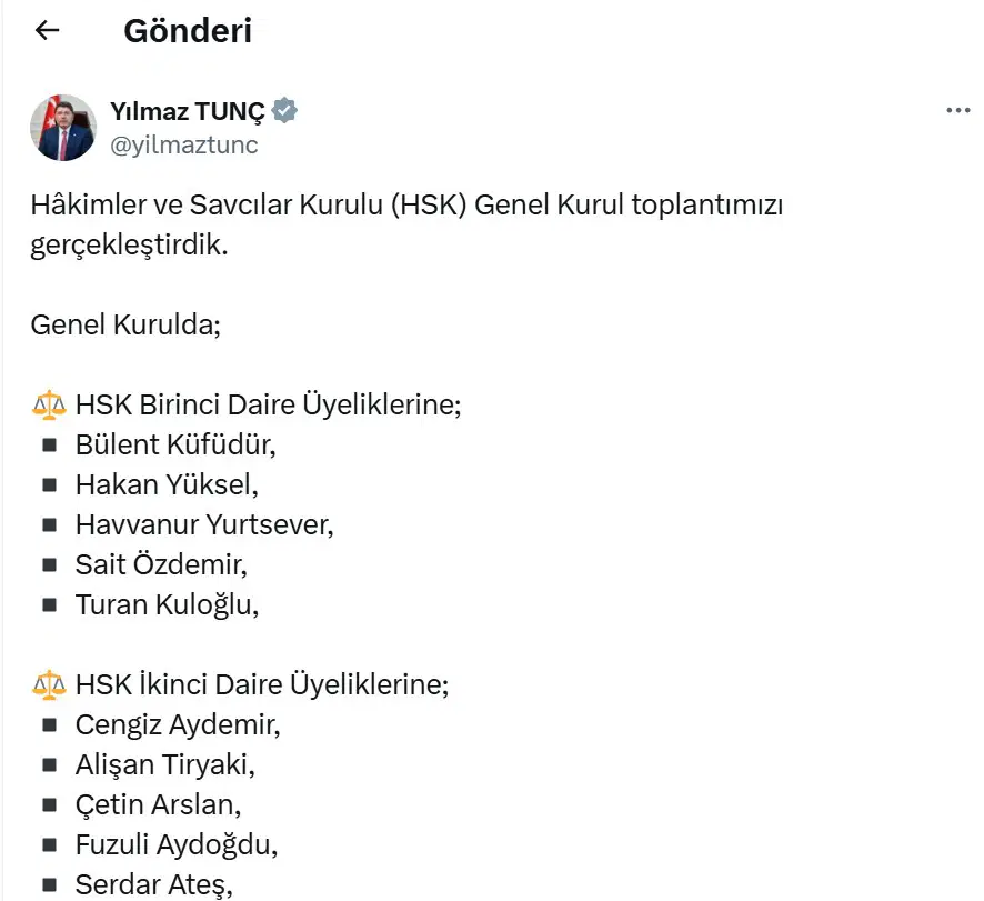 Bakan Tunç, sosyal medya hesabından yaptığı açıklamada, HSK Genel Kurul toplantısını gerçekleştirdiklerini belirterek, “Genel Kurulda; HSK Birinci Daire Üyeliklerine Bülent Küfüdür, Hakan Yüksel, Havvanur Yurtsever, Sait Özdemir, Turan Kuloğlu, HSK İkinci Daire Üyeliklerine Cengiz Aydemir, Alişan Tiryaki, Çetin Arslan, Fuzuli Aydoğdu, Serdar Ateş, Seyfi Han seçilmiştir. HSK Birinci Daire Başkanlığına Turan Kuloğlu, HSK İkinci Daire Başkanlığına ve HSK Başkan Vekilliğine Fuzuli Aydoğdu seçilmiştir. HSK daire başkanlarımıza ve üyelerimize görevlerinde üstün muvaffakiyetler diliyorum. Yargı teşkilatımız, ülkemiz ve milletimiz için hayırlara vesile olmasını temenni ediyorum” dedi.