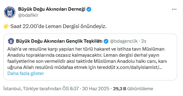 İBDA-C’ye yakın olduğu ileri sürülen Büyük Doğu Akıncıları Derneği ise sosyal medya hesabından Leman dergisinin önünde toplanma çağrısı yaptı.