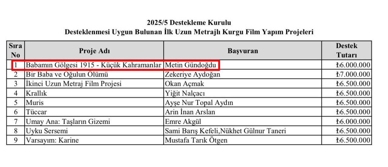 Yayımlanan listeye göre, AKP’li Gündoğdu’nun bakanlığın sinema sektörüne yönelik destek uygulamasına “Babamın Gölgesi 1915 – Küçük Kahramanlar” adlı projeyle başvurduğu öğrenildi.