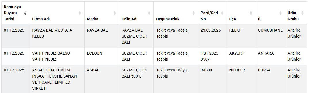 Listeye toplam 3 yeni ürün daha eklendi. Listede bal ürünleri yer aldı. Yapılan son testlerde, bazı markaların ‘bal’ ibaresiyle sattığı üründe taklit veya tağşiş yaptığı belirlendi.