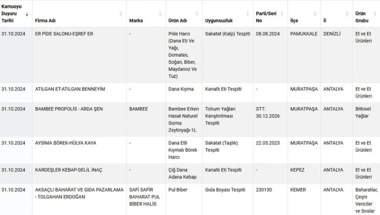 Bu listeye göre, pide harcından kalp, dana kıymadan kanatlı eti, zeytinyağından tohum yağı, kıymalı börek harcından taşlık, adana kebaptan kanatlı eti, pul biberden gıda boyası, kekikten yabancı madde, sumaktan gıda boyası, peynirden bitkisel yağ ve terayağından bitkisel yağ çıktı.