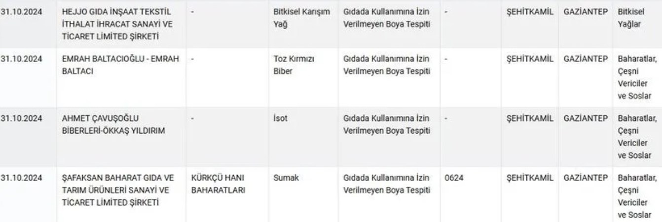 ‘Sağlığı Tehlikeye Düşürecek Gıdalar’ listesine ise bitkisel karışım yağ, toz kırmızı biber, isot ve sumak eklendi. Bu ürünlerde ‘gıdada kullanımına izin verilmeyen boya’ tespit edildi.
