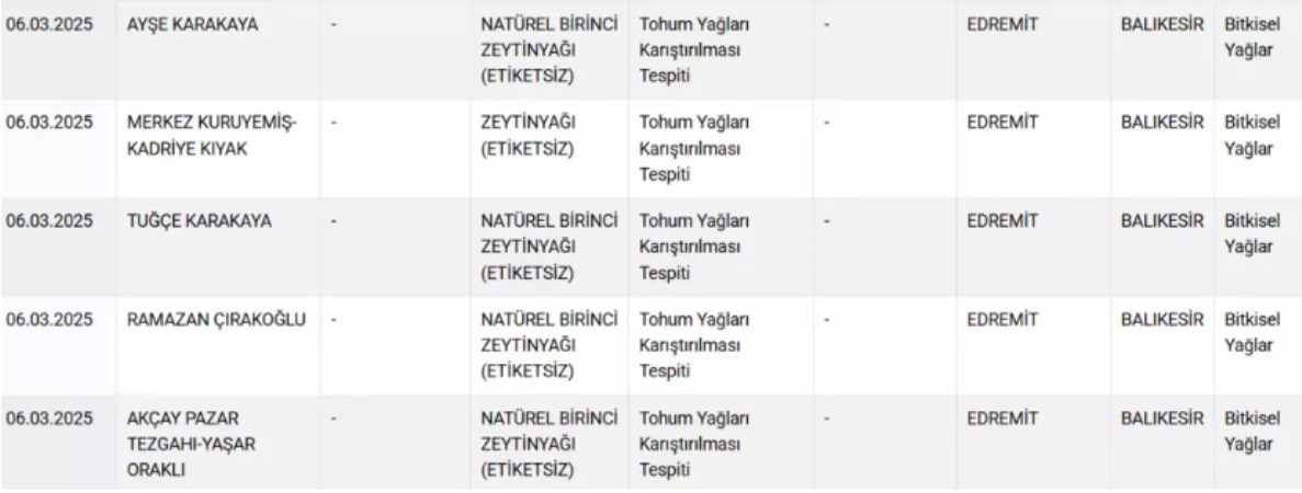 Bakanlığın yeni ifşa listesinde en dikkat çeken ürünlerden biri de zeytinyağı oldu. Tamamen doğal olması gereken zeytinyağlarına tohum yağları ve daha düşük kaliteli zeytinyağlar karıştırıldığı tespit edildi.