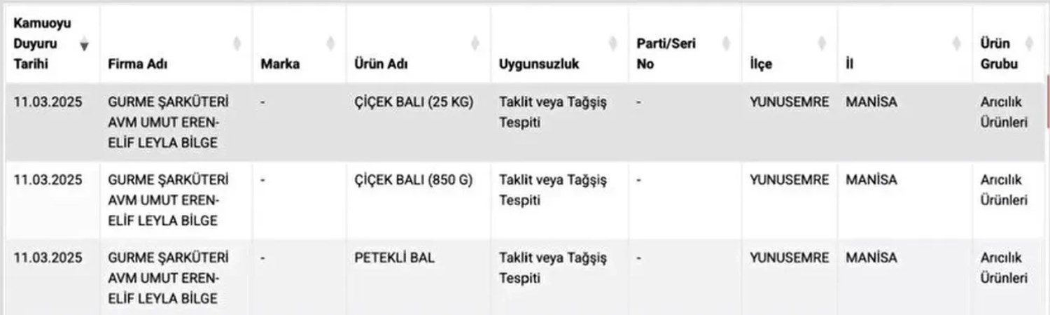 Bakanlık tarafından 11 Mart tarihinde açıklanan listede, GURME ŞARKÜTERİ AVM UMUT EREN-ELİF LEYLA BİLGE firmasına ait çiçek balı ve petekli balda sahtecilik belirlendi.