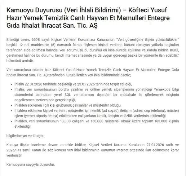 Kişisel Verileri Koruma Kurumu (KVKK), Köfteci Yusuf Hazır Yemek Temizlik Canlı Hayvan Et Mamulleri Entegre Gıda İthalat İhracat San. Tic. AŞ ile ilgili veri ihlali açıklamasında bulundu.