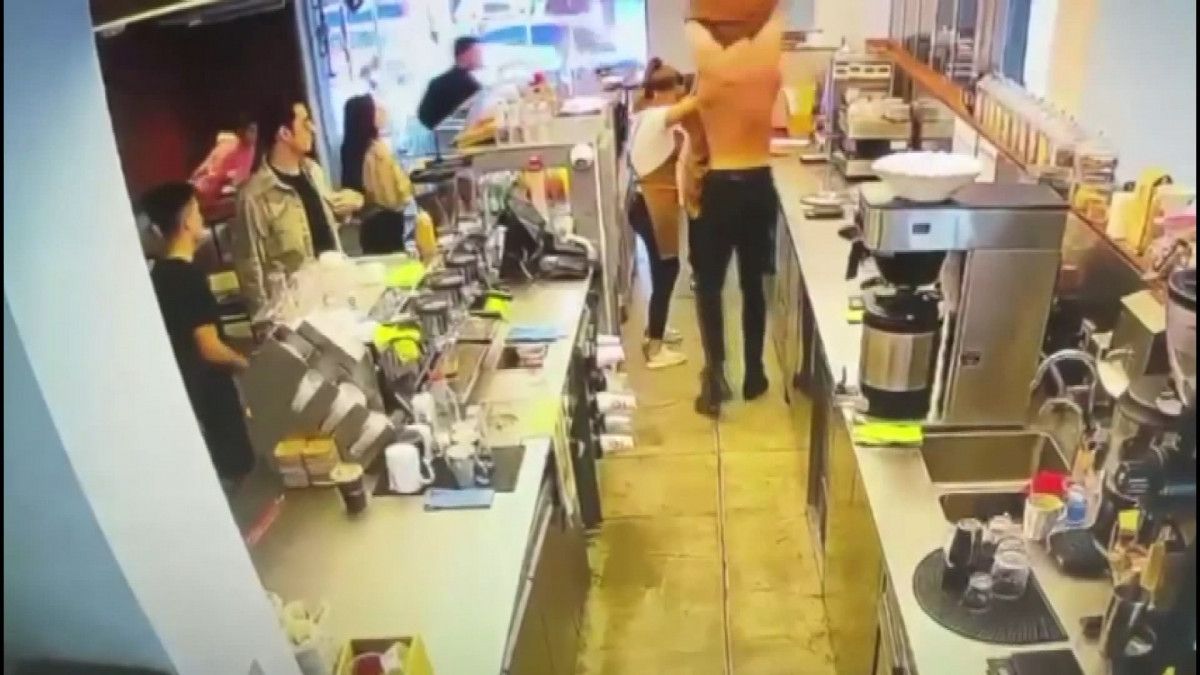 Çalışanlar ve diğer müşterilerin engel olmaya çalıştığı öfkeli kişi, peş peşe yumruk atarak baristayı yere düşürdü.