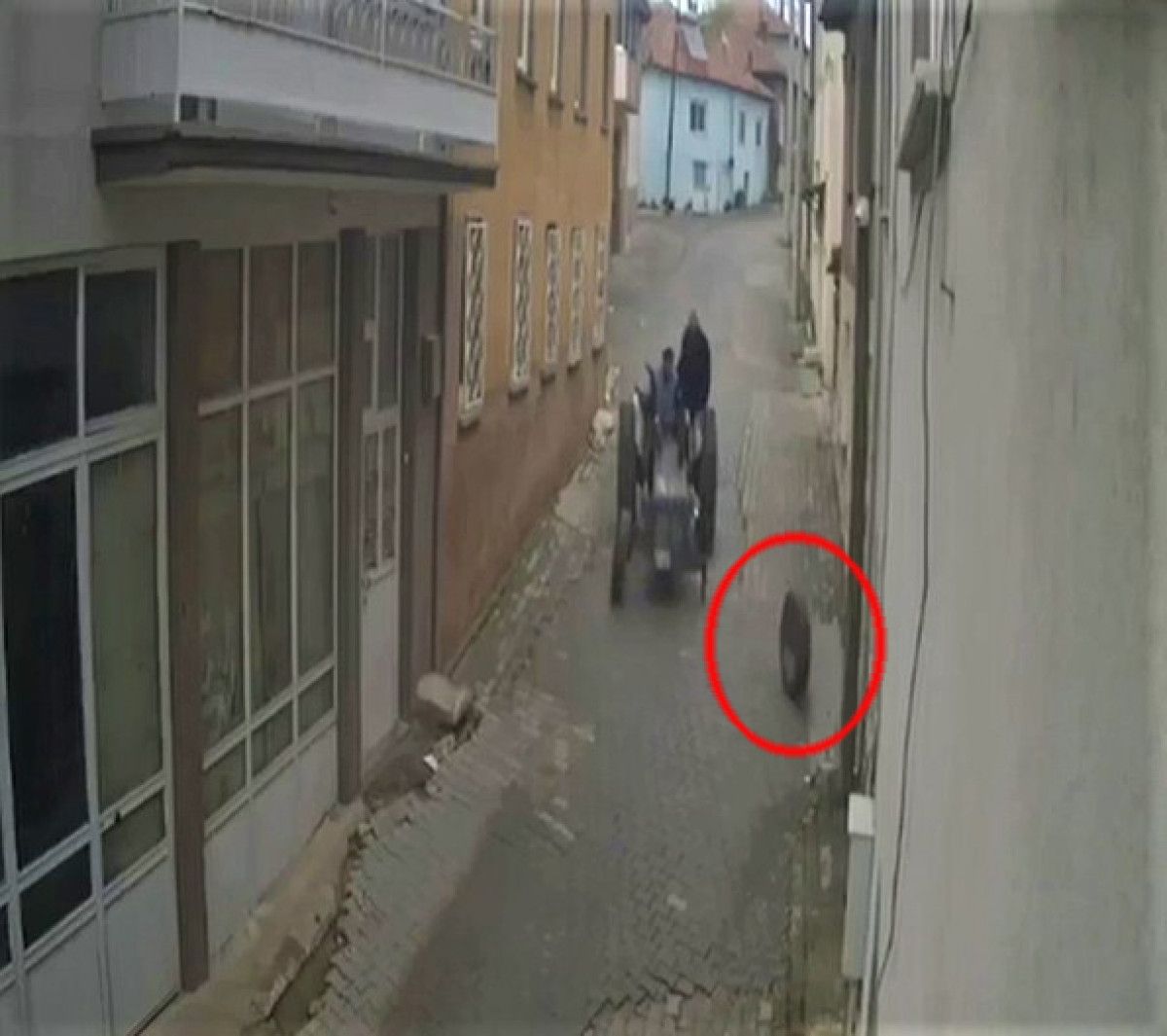 Otomobile doğru gelen lastiği son anda fark eden polis memuru, durdurmak için koştu, ancak yetişemedi.