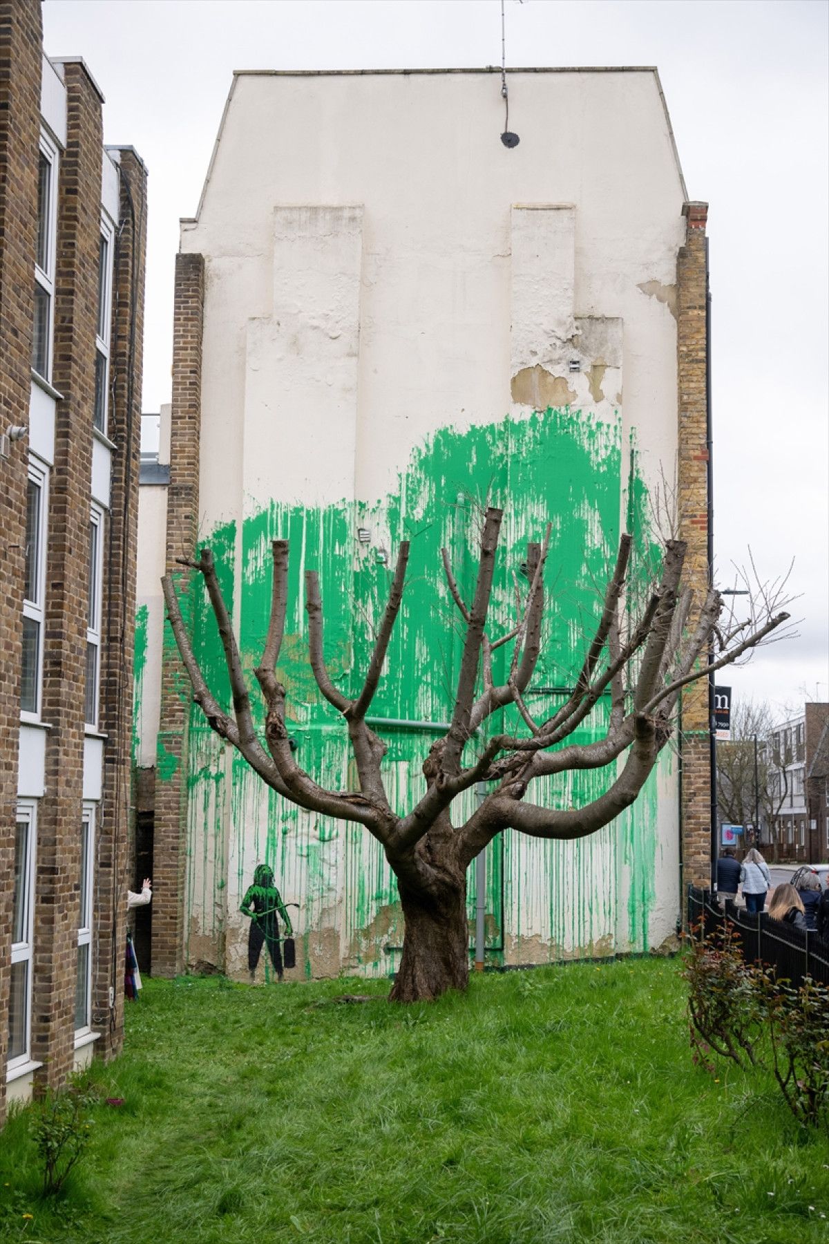 Banksy bir gecede geldi. Şimdi kiram fırlayacak. Finsbury Park’taki Banksy’nin yeni eserinin gururlu yeni bekçileri… Bu sabah dairenin kenarında bu eseri görerek uyandım.