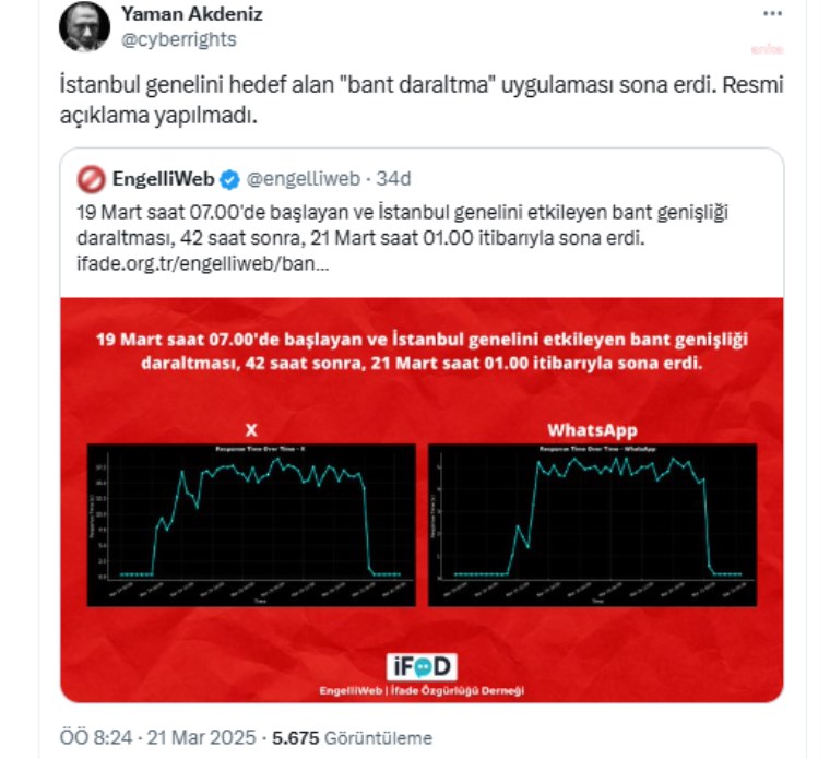 İfade Özgürlüğü Derneğinden Prof. Dr. Yaman Akdeniz, konuya ilişkin sosyal medya hesabından yaptığı açıklamada, ”İstanbul genelini hedef alan ‘bant daraltma’ uygulaması sona erdi. Resmi açıklama yapılmadı” ifadelerine yer verdi.