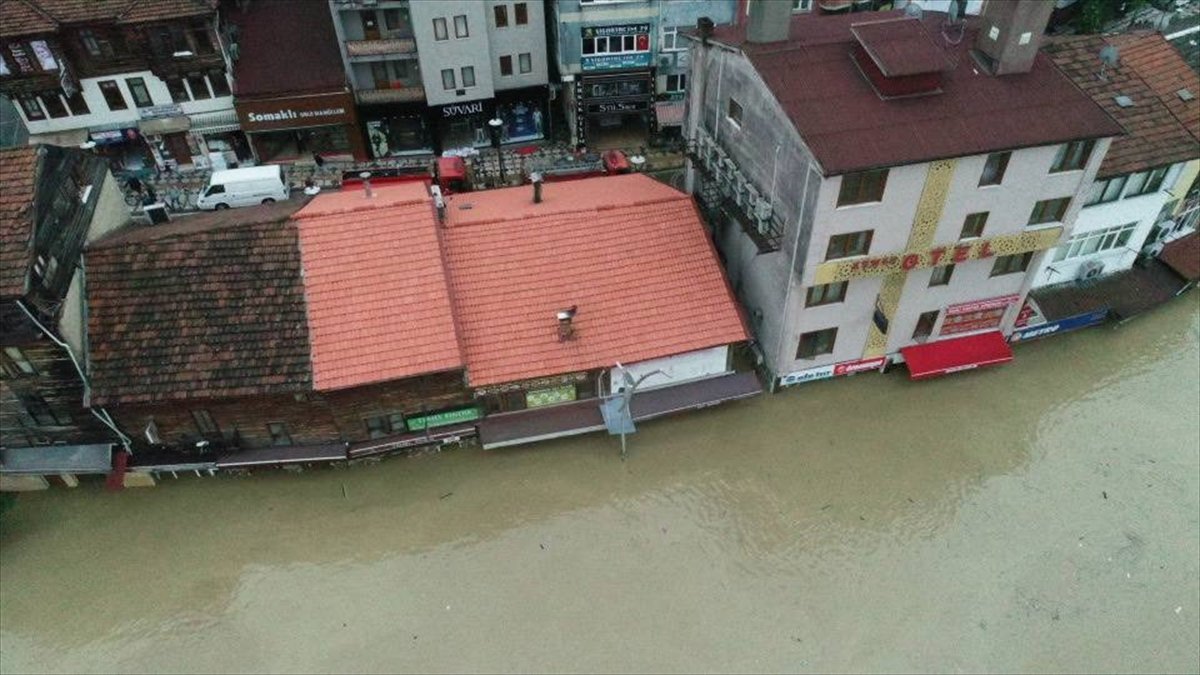 Yaklaşık 9 metre yüksekliğindeki tarihi Kemerköprü’nün su altında kaldığı bölgede, çok sayıda iş yerini su bastığı görüldü.