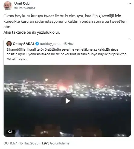 Bunun üzerine Saral’a Saadet Partisi Genel İdare Kurulu Üyesi Ümit Çebi’den Saral’a dikkat çeken bir tepki geldi. Saral’a “Oktay bey kuru kuruya tweet ile bu iş olmuyor” diye seslenen Çebi, “İsrail’in güvenliği için Kürecik’te kurulan radar istasyonunu kaldırın, ondan sonra bu tweet’leri atın. Aksi takdirde bu iki yüzlülük olur” dedi.