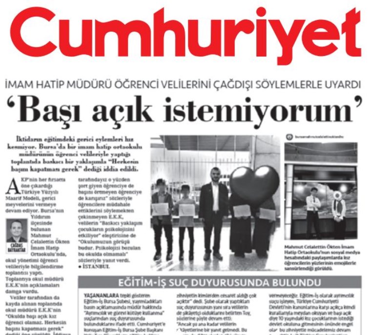 Bursa’nın Yıldırım ilçesinde bulunan Mahmut Celalettin Ökten İmam Hatip Ortaokulu müdürü E.K.K. hakkında gazetemizin ortaya çıkardığı “Başı açık öğrenci istemiyorum” sözleri sonrası Bursa Valiliği tarafından hakkında soruşturma başlatılmıştı. Cumhuriyet’e konuşan öğretmenler, müdürün misal yaklaşımlar sergilediğini ileri sürdüler. Tezlere nazaran 24 Haziran’da müdür, öğretmenlerle seminer haftası kapsamında toplantı yaptı. E-sınav kapsamında okulda imtihana giren bir yurttaş hakkında “Çırılçıplak gelmiş hanımefendi. Böylesine hanım da denmez ya. Gittik uyarmaya. Günaha da girdik mecbur uyarmak için. Kozmetik dalına de hakim değilim lakin bu ağdadan sonra bir de vernik mi çekiyorlar nedir her yeri parlıyor” tabirlerini kullandı.