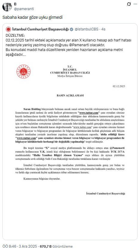 Başsavcılık ayrıca, ilk açıklamada X kullanıcı adının harf hatasıyla yazıldığını, 02.12.2025 tarihli metindeki bu maddi hatanın düzeltilerek hesabın adının “@Pamenarti” olduğunu duyurdu. Düzeltme paylaşımında, hatanın giderildiği yeni açıklama metninin yeniden kamuoyunun bilgisine sunulduğu belirtildi.